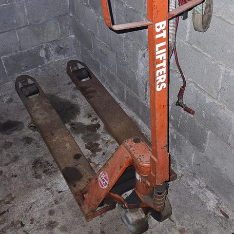 Manuell pallejekk egnet for løfting og forflytning av paller og annet gods på jevnt underlag, for eksempel på lager, verksted eller i garasje. Utstyrt med styreskaft og gaffelbein tilpasset standard europaller. Laget i metall med lakkert overflate.