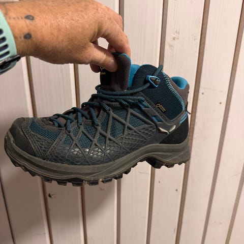 Modellen er en halvhøy tursko i blått med sorte og gule detaljer. Overdelen er i tekstil og syntetisk materiale med forsterkninger på tå og hæl. Skoene har hurtigsnøring og grovmønstret yttersåle i gummi for godt grep. Egnet til tur og hverdagsbruk for barn.