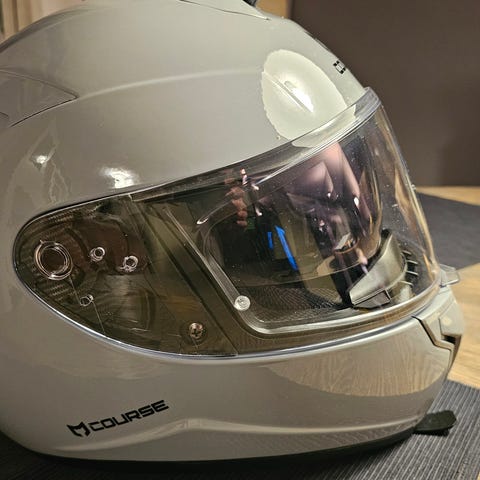 Helhjelm Course Raider Evo Blank Nardogrå med heldekkende visir og integrert solvisir. Hjelmen har ventilasjonsåpninger på toppen, foran og bak for luftgjennomstrømming. Hakefestet har hurtigspenne (magnet).
