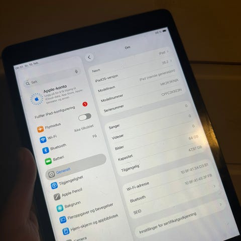 Pent brukt iPad Air modell A1475. Ser ingen riper i skjermen. Maskinen er rensket og satt tilbake til Fabrikkinnstillinger og klar til ny bruker. 9.7" Retina-skjerm. Batteriet holder greit på strøm. Originalkabel og lader følger med. WiFi + SIM-kort (mobilnett)
