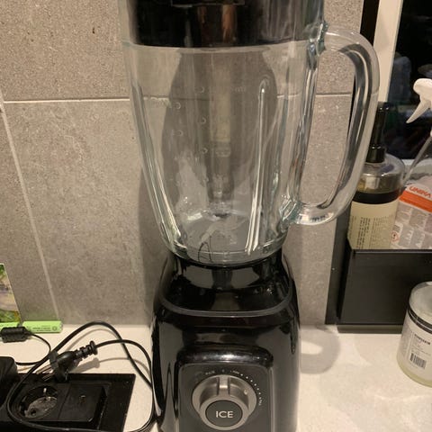 Philips blender med glasskanne i svart utførelse. Blenderen har en gjennomsiktig kanne i glass med målemarkeringer og håndtak. Basen er i svart plast med betjeningshjul på fremsiden. Egnet til miksing av for eksempel smoothies, supper og sauser på kjøkkenet.