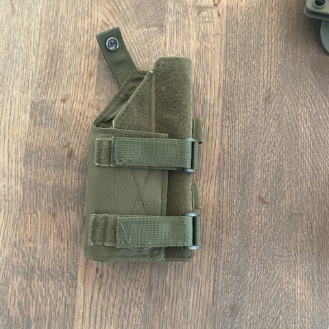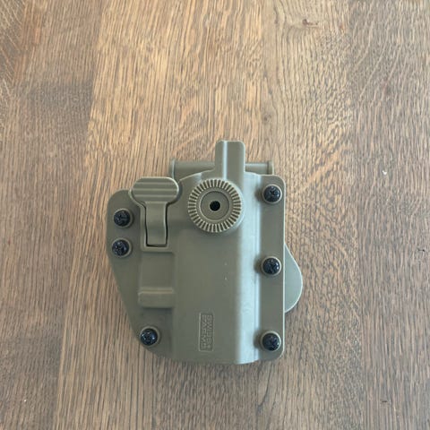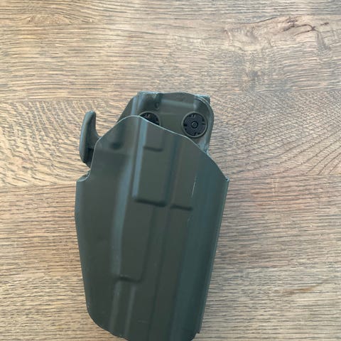 Den ble satt på en Nuprol glock hylster på den så den følge med ! Hylsteret kan justeres også siden den sitte litt skjevt den ble kjøpt hos game on for cirka 800