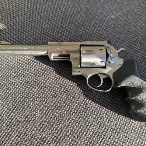 Selger en Smith & Wesson Model 686-5 i den internasjonale spesialvarianten "Wheelgunner", kaliber .357 Magnum. Revolveren er i rustfritt stål med 6-toms pipe og L-frame konstruksjon. Utstyrt med Hogue gummigripper og justerbart sikte bak.