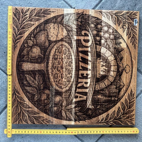 Serveringsbrett / Skjærefjøl i tre med inngravert motiv av vinflaske, vinglass, drueranke og ost.