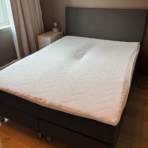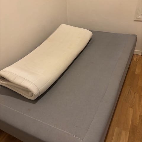 Rammemadrassen har grå tekstiltrekk med ben. Sengen er 140 cm bred 200 cm lang. Egnet for én eller to personer.
