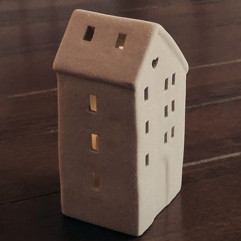 lyshus i hvit keramikk. Huset har utskårne vinduer og åpning foran for plassering av telys eller liten lykt. Egnet som dekorasjon innendørs på bord, hylle eller vinduskarm. Designet gir lys gjennom vinduene når lyset er tent, og skaper et husformet lysspill rundt produktet.