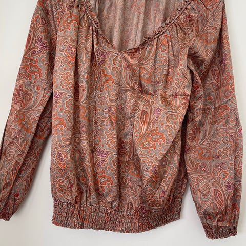Sort bluse fra Part Two i størrelse 44 🌸 Blusen har blomsterprint i okergult, rosa og off white. Den har høy hals med knapp i nakken. Blusen er pent brukt! Modellen heter Nanette.