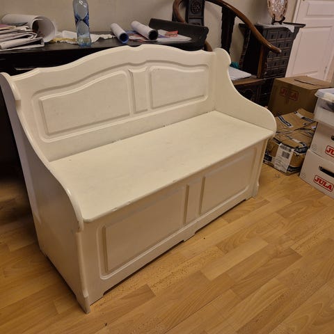 Fin hvit benk/brisk med stort rom til oppbevaring. Litt slitasje på armlene.
