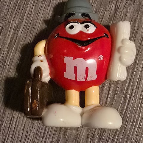 Opprinnelse: Denne spesifikke figuren ble utgitt rundt år 2001 av Mars Inc.. Den ble ofte solgt som en "topper" eller dekorasjon på M&M-godteribeholdere.