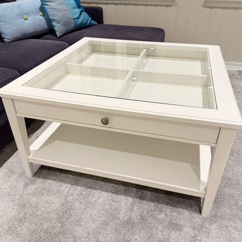 Meget solid, stabilt og pent sofabord av god kvalitet selges rimelig. Utført i heltre med fine utskjæringer, med praktisk glassplate. Det er 4 praktiske skuffer som alle fungerer fint.