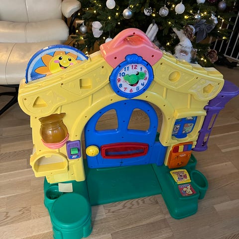 Fisher-Price Little People dukkehus med flere etasjer og rom, inkludert kjøkken, stue og soverom. Settet inneholder flere Little People-figurer, hund, samt diverse møbler og tilbehør som stoler, bord, sofaer, kjøkkeninnredning, peis, toalett og planter. Plastmateriale tilpasset små barnehender. Egnet for rollelek og hverdagslek for barn som liker dukkehus og figurer.