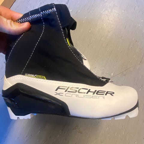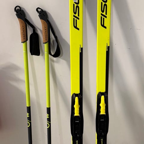 Fischer langrennski på 204 cm med tilhørende Fischer langrennsskisko i str 39 og Swix langrennsstaver på 145 cm.