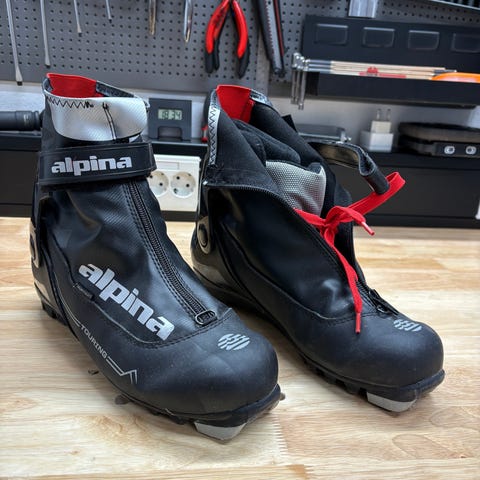 Alpina langrennsstøvler i størrelse 44. Klassisk modell med snøring og glidelås i front, samt borrelåsreim øverst for ekstra støtte rundt ankelen. Overdel i syntetisk materiale med vannavvisende trekk, fôret innside for varme og komfort. Såle tilpasset klassisk langrennsbinding (NNN-type). Fargekombinasjon svart og grå med Alpina-logo på siden og reimen. Egnet til tur- og mosjonslangrenn.