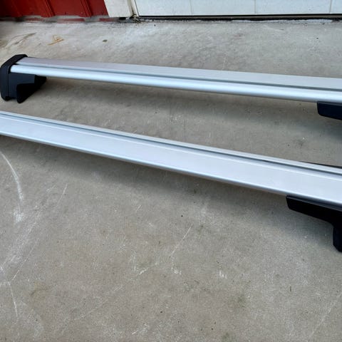 Thule takstativ med skiholdere i aluminium med plastdetaljer. Settet består av to lastestenger med integrerte skiholdere, låsbare endestykker og tilhørende festedeler. Instruksjonshefte og tilbehør som vises på bildene følger med. Egnet for transport av ski eller snowboard på bilens tak.