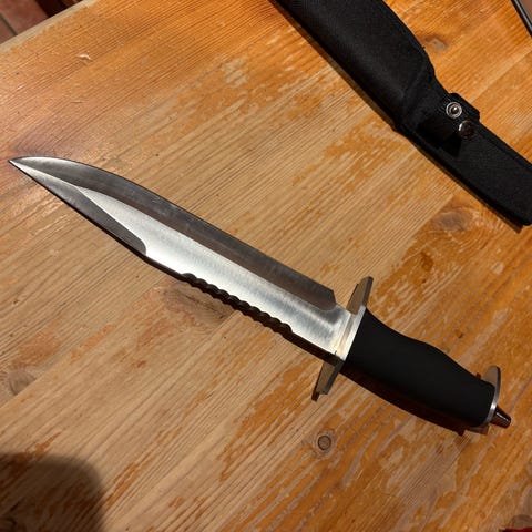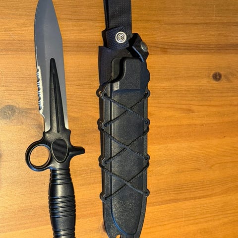 Japansk inspirert sylskarp kampsport kniv,i svart utførelse. Kniven har rett blad og håndtak med snor/fangsnor. Egnet som allround kniv til friluftsliv og turbruk. Sylskarp nokk til å kunne barbere bort hår. Selges 850kr