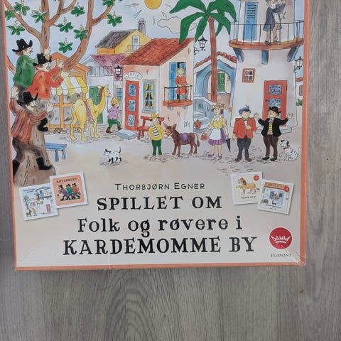 Brettspillet er basert på Thorbjørn Egners fortelling om Kardemomme by. Esken inneholder spillebrett med fargede felter, spillebrikker i ulike farger og kort med motiver fra Kardemomme by. Spillet leveres med spilleregler på norsk trykket på eget ark.