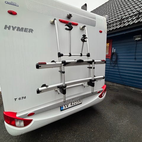 Sykkelstativ for bobiler med garasjeanlegg. Med valgfritt tilbehør kan du ta opptil 4 sykler. Når den ikke er i bruk kan den slås sammen og dekker kun 22 cm.