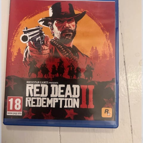 Rockstar Games Red Dead Redemption II Playstation 4 spill. Fysisk utgave på Blu-ray disk for PS4-konsoll. Spillet er et action-eventyr satt til et westernmiljø. Aldersgrense 18 år ifølge PEGI-merking på omslaget. Leveres i originalt PS4-cover med spilldisk og trykt materiale som vist på bildene.
