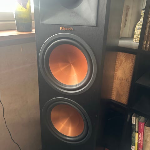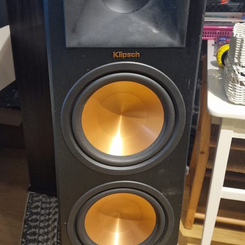 To Klipsch RP-250F-høyttalere, en Klipsch R-52C senterhøyttaler