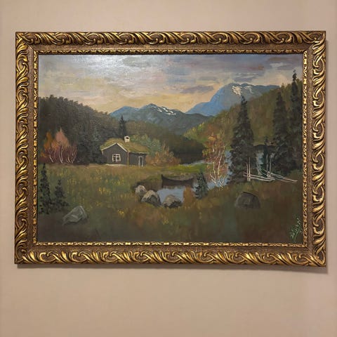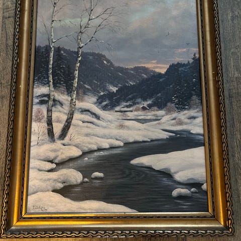 Landskapsmaleri med vintermotiv i farger som brunt, hvitt og blått. Bildet viser et åpent landskap med snø, fjell i bakgrunnen, trær i forgrunnen og skyet himmel. Maleriet er innrammet i en dekorativ, lys ramme. Egner seg som veggdekor i stue, gang eller andre oppholdsrom. Mener at det står H. Leander