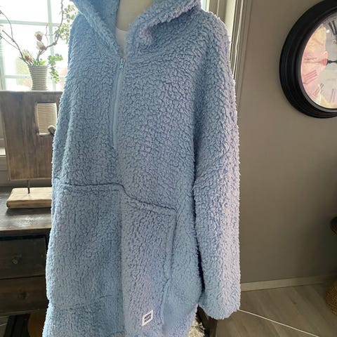 Happy hoodie i katte print, den er oransje og i one size. Den er kjempestor, passer nok de fleste. Både lang i armene og i lengden (se på bildet) jeg er 170 høy og bruker xs/s til vanlig så denne er veldig stor på meg. Kjempe myk inni og perfekt kose genser! Den er pent brukt og ingen bruksmerker som jeg har lagt merke til.🐾