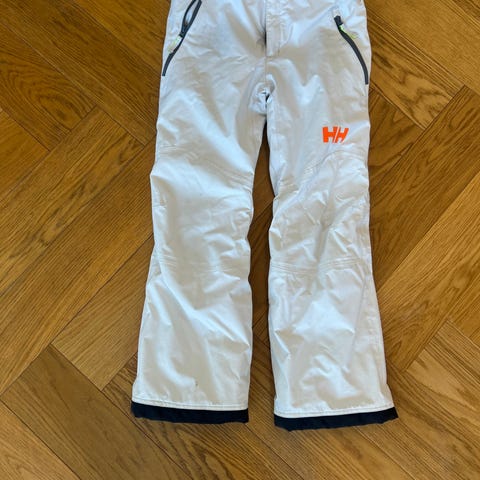 Helly Hansen skibukse i hvit farge, størrelse 152/12 år. Buksa har RECCO-reflektor for økt søkbarhet ved skred. Modellen har glidelåslommer foran og snølås nederst på beina med elastisk avslutning. Passer til alpint, snowboard og annen vinteraktivitet for barn rundt 12 år.