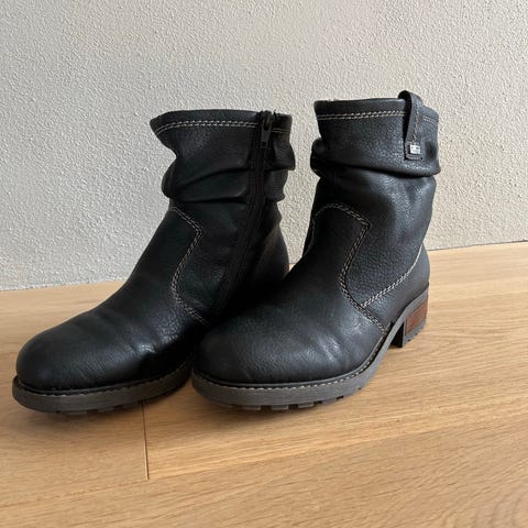 Svarte støvler med grov såle og glidelås på siden for enkel av- og påkledning. Overdelen er i skinn eller skinnlignende materiale, og innsiden har mykt fôr som gir ekstra varme. Passer godt til bruk i kaldt vær og til hverdags når man trenger varme og solide sko.