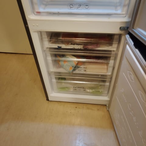 Samsung kjøleskap og frys:) fungerer som det skal, brukt i oppussingsleiligjet og er derfor litt skittent.. ellers god stand, med unntak av en liten sprekk i døra som vist på bildet☺️