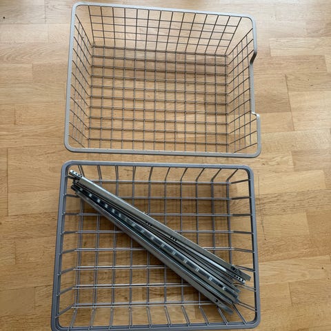 Kjøpt nytt i USA for ca 15 år siden. Kurvene er 44cm brede og 54cm dype på toppen. Er i Ikea komplement serien, men ser ut som om det er litt andre mål enn det som er på markedet i Norge i dag. Skuffeseksjonen er laget for å monteres inne i et større skap, den har en full sidekant, men kun skinner til motsatt vegg. Seksjonen er ca 80 cm høy og ca 57 cm dyp
