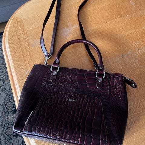 Skinnveske i burgunder farge. Vesken har to skulderstropper og klaff som kan brettes over åpningen. Innvendig er det lyst fôr med flere rom og glidelåslommer for organisering av innhold. På baksiden er det en ekstra glidelåslomme. Egner seg som hverdagsveske eller til jobb og studier, med plass til personlige eiendeler og mindre gjenstander.