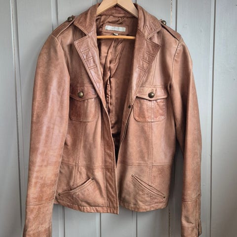 Marie Philippe skinnjakke for dame i brun farge, størrelse 42. Jakken har glidelåslukking foran og flere lommer med glidelås på brystet. Den er laget av 100 % skinn med fôr i 100 % polyester. Rens anbefales hos lærspesialist i henhold til vaskeanvisningen. Passer som ytterjakke i overgangssesonger og til hverdagsbruk. Kom gjerne med bud