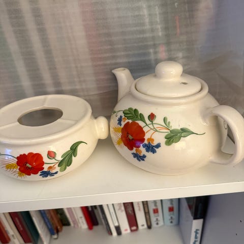 Selger en fin retro tekanne i nydelig mørkegrønn og burgunder farge, med matchende sukkerskål med lokk.