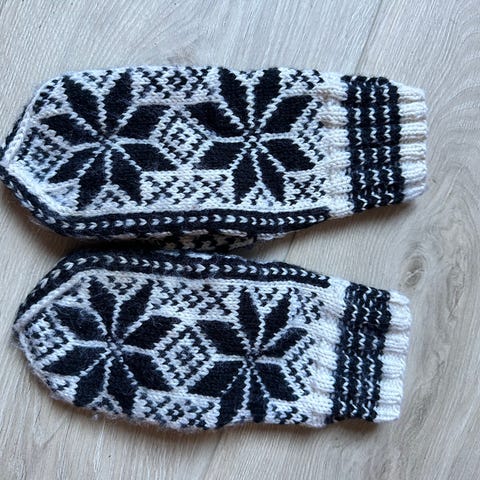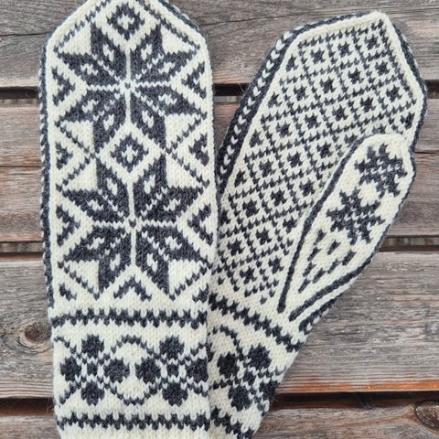 Selbuvotter herre strikket i Viking ullgarn, mørkeblå og hvit, lengde på votten 28 cm