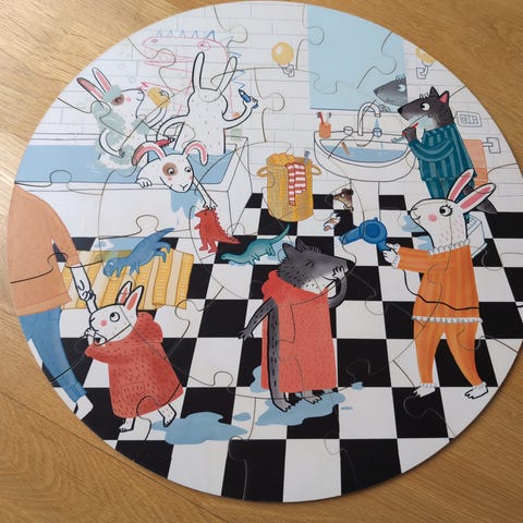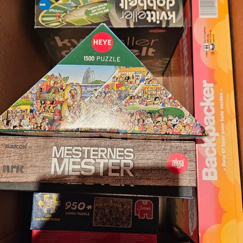 Rundt puslespill med julemotiv. Motivet viser kaniner, snømann og godteri i vinterlandskap. Puslespillet består av mindre brikker og danner en rund form som ligner en julekule når det er ferdig lagt. Egnet som aktivitet for barn eller hele familien i førjulstid og vinterhalvår.