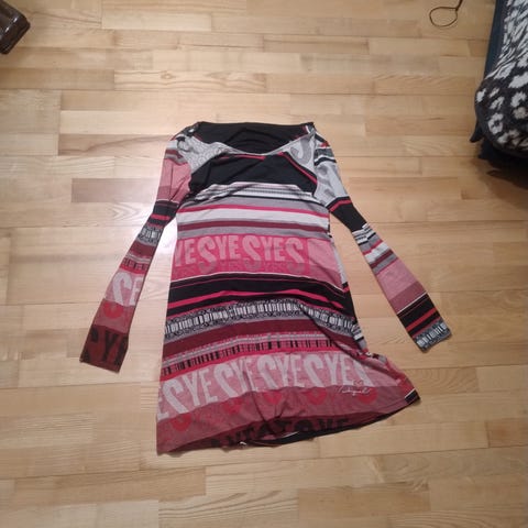 Hverdagskjole for dame i størrelse M. Kjolen er flerfarget med ulike mønsterfelt i kontrastfarger. Materiale i viskose gir et mykt og lett fall. Modellen har lange ermer og knelang lengde (anslått ut fra bildene). Egnet som hverdagskjole eller til uformelle anledninger.