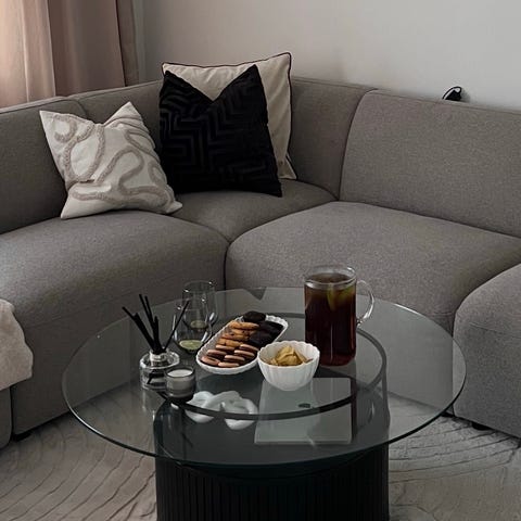 Bordet har sort metallramme og mørkt glass. Solid og stabil konstruksjon. Det finnes noen bruksriper i glasset, men disse er lite synlige i daglig bruk og påvirker ikke funksjon eller helhetsinntrykk.