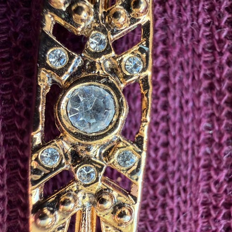 Nydelig bronzefarget nål med en perle og 6 strassperler.,