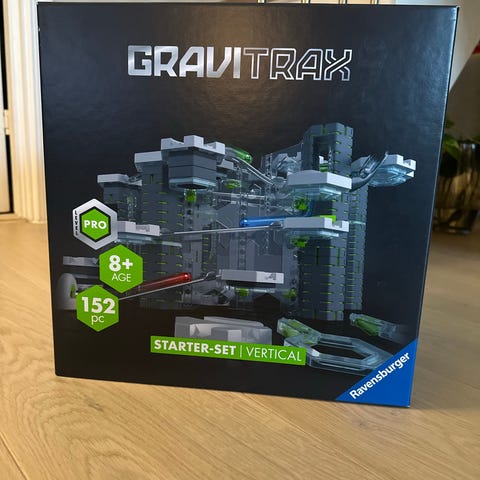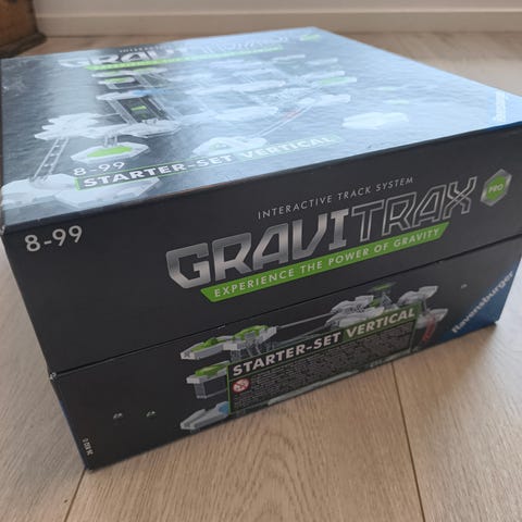Gravitrax Starter-Set Vertical byggesett kulebane. Settet består av moduler og deler for å bygge en tredimensjonal kulebane i flere nivåer. Delene kan kombineres på ulike måter for å lage egne baner og eksperimentere med fart, tyngdekraft og retning. Egnet som konstruksjonsleke for barn fra 8 år og oppover.