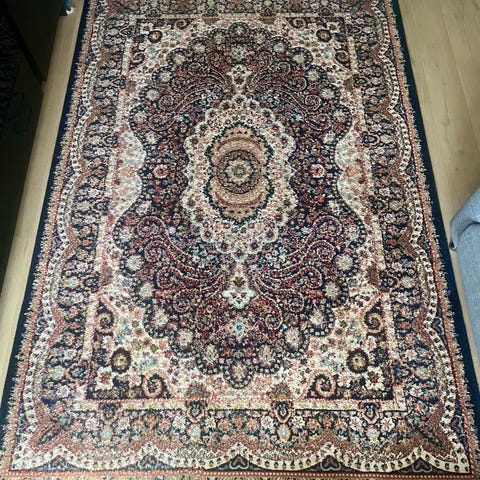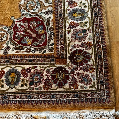 "M. Maktabi persisk / orientalsk tepper, Oslo", i følge forhandler, trolig nypris ca. 15.000 kr i butikk for ca. 30 år siden. Bud mottas. Pene og harmoniske farger. Har vært i bruk i stue og noe slitasje og mulig behov for rens. Må hentes på Nordstrand i Oslo og betales kontant eller Vipps ved henting. Sendes ikke og pga. alder på teppet har vi noe begrensede opplysninger da vi som selger ikke selv har hatt teppet.