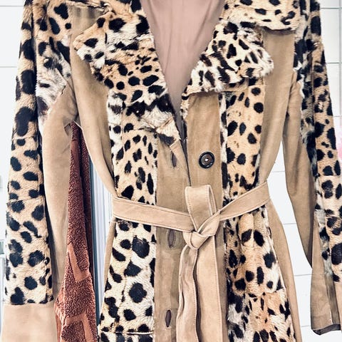 Den har en krage i sort fuskepels som gir et eksklusivt og sofistikert uttrykk. Nederste knapp har falt av, kan eventuelt sy den på før salg eller legge ved om en ønsker det selv <3