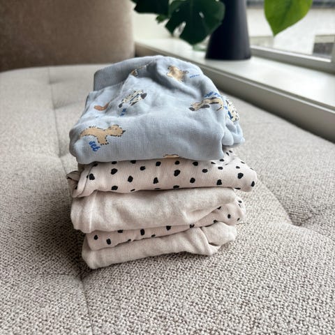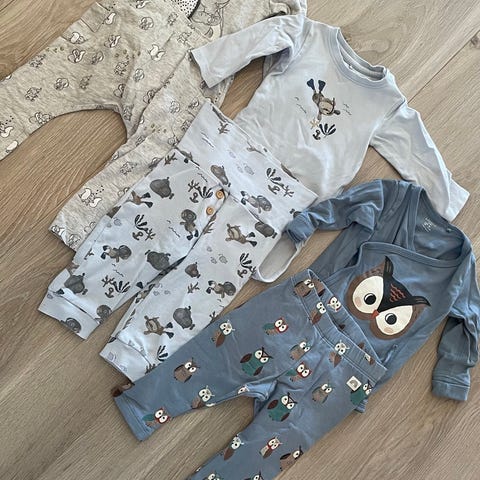 Lindex babysett med body og bukse i størrelse 74, unisex. Settet består av en grønn langermet body med kattemotiv, en mønstret langermet body i lyse toner og en ensfarget grønn bukse. Klærne er laget i mykt materiale egnet for baby, og passer til hverdagsbruk. Fargene går i grønne og nøytrale nyanser som kan kombineres med annet barnetøy i samme størrelse.