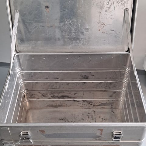 kan låses med en hengelås. Håndtak på 2 kortsider. lite avlangt rom innvendig på den ene siden (hylle).