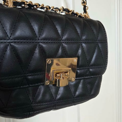 Denne vakre Michael Kors skuldervesken er laget av mykt svart skinn med et elegant vattert, rutete mønster. Den har en klaff med gullfarget metallås, en kjedestropp med skinndel på skulderen og en praktisk utvendig baklomme. Innvendig finner du et hovedrom og en mindre lomme for organisering. Denne allsidige vesken passer perfekt til både hverdagsbruk og mer formelle anledninger.