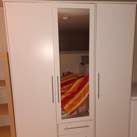 Skeidar garderobeskap. Skapet har to dører med runde knotter, en klesstang på den ene siden og flere faste hyller på den andre siden. Nederst er det to mindre skuffer øverst og to større skuffer nederst for ekstra oppbevaringsplass. Passer til oppbevaring av klær og tilbehør på soverom, barnerom eller i gang. Øverst i skapet er det også god lagringsplass. To av skuffene har et par flekker ellers er skapet fint. Skapet må hentes.