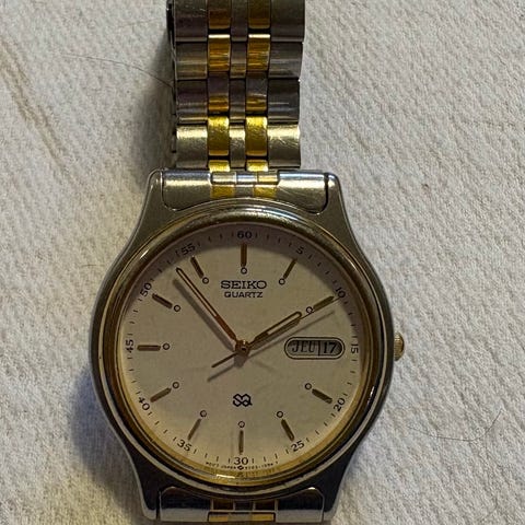 Seiko herreklokke med analogt urverk og dag- og datovisning på urskiven. Klokken har rund sølvfarget urskive med tydelige timemarkeringer og visere. Urkassen og lenken er i metall med sølvfarget finish, og lenken har foldespenne. Passer som hverdagsklokke til herre. Virker som den skal