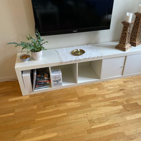 TV-benken har to skap med dører og et åpent rom i midten som kan brukes til TV-utstyr, spillkonsoller eller andre enheter. Topplaten gir plass til TV eller dekor.