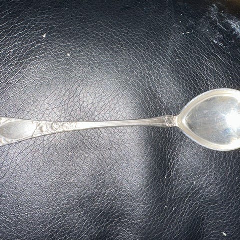 Gammel rose sølv. Dekorert serveringsskje i sølv med buet skaft og mønstret håndtak. Skjehodet har gullfarget innside og er relativt stort, egnet til servering av for eksempel dessert eller kaker. Detaljerte graveringer langs skaftet og på enden gir et klassisk, ornamentert uttrykk. Det er gravert dato bak 24.12.45. Bud mottas.