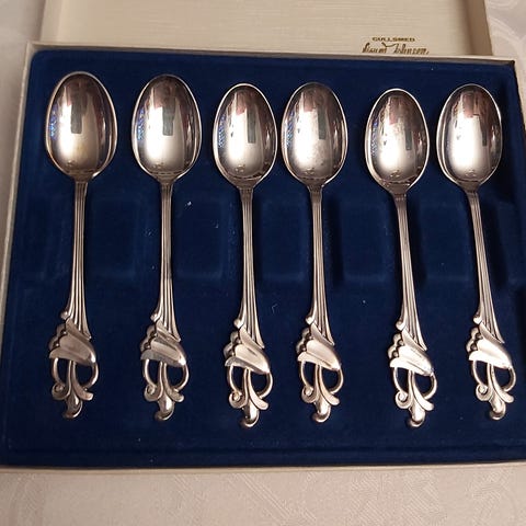 Pent brukte teskjeer i sølv (830S). 11,5 cm og 10,5 g.