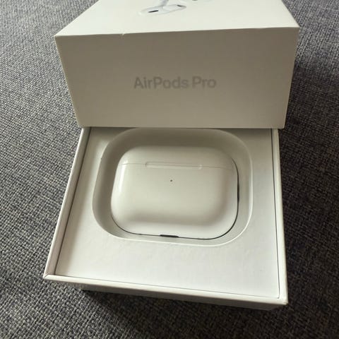 Apple AirPods Pro trådløse ørepropper i hvit farge. Modellen leveres med ladeetui som vises på bildet. Øreproppene kobles trådløst til kompatible enheter via Bluetooth og er beregnet for bruk med blant annet mobil, nettbrett og datamaskin. Egner seg til lytting av musikk, tale og annet lydinnhold i hverdagen.