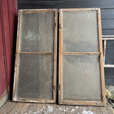 Vindu gis bort. Uklart hvor gammelt vinduet er, huset mitt er fra 1956, jeg kjøpte huset i 2003, vinduet er fra en gang mellom de årstallene. Vinduet fungerer helt ok, men har ikke noen god U-verdi. Jeg måler det til å være 139x119cm langs ytterkanter av karmen. Karmen er stemplet 14x12.